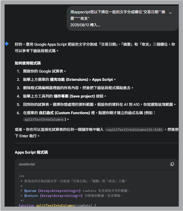 根據我的經驗,雖然AI可以直接讀原始數據(後續方便討論,我們稱它為RawData),搭配我們期待的最終效果範例,但這不是我心中的最優解,對我來說更穩定有效率的作法是寫一段VBA或Apps Script的程式來處理這些文字內容,重新劃分為我期望的表格。不過,為了這種一個月一次的需求,我實在懶得寫程式…